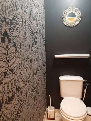 This apartment is equipped with a pleasant bathroom. This bathroom is furnished with all the equipment you need for a comfortable stay: bath towels, bath tub, sink, towel rack, ventilator. The toilets are separated from the bathroom and located in an independant room.