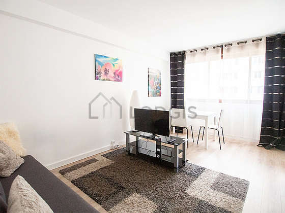 Living roomThis apartment consists of a beautiful living room with wooden floor and its windows. This very quiet living room is furnished and equipped for a comfortable stay: tv, linen, quilt, dining table, shelves, cupboard, 4 chair(s), tv stand, carpet1 sofabed(s) of 160cm.