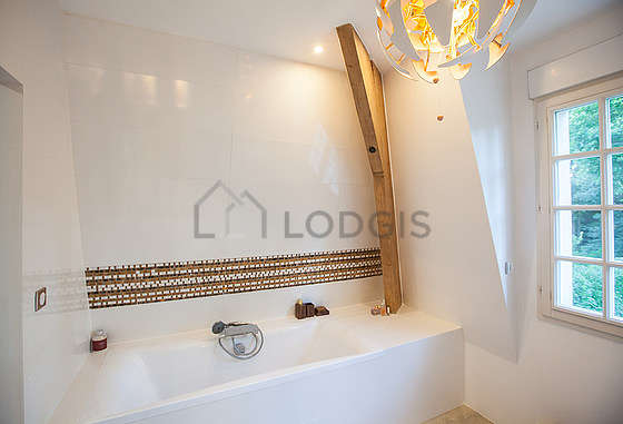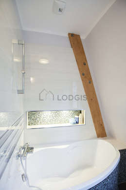 This house is equipped with a bathroom with double-glazed windows. This bathroom is furnished with all the equipment you need for a comfortable stay: cupboard, bath tub, separate shower, sink, mirror, towel rack, towel drying radiator, ventilator. The toilets are separated from the bathroom and located in an independant room.
