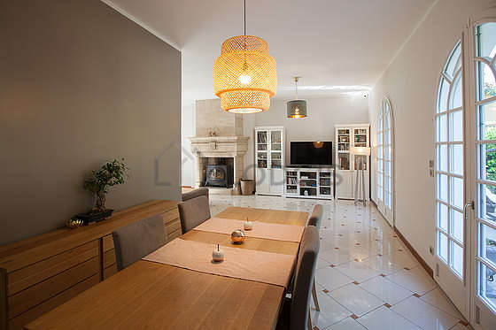 This house consists of a living room with tile floor and its double-glazed windows. This living room is furnished and equipped for a comfortable stay: sofa, dining table, coffee table, bookcase, shelves, closet, storage space, fireplace, 1 chair(s), floor lamp, tv stand.