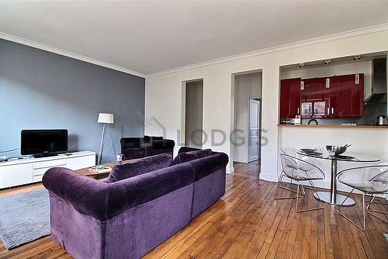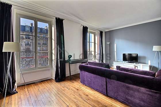 Living roomThis apartment consists of a fabulous living room with wooden floor and its windows. This very quiet living room is furnished and equipped for a comfortable stay: tv, sofa, 1 armchair(s), dining table, coffee table, shelves, cupboard, 4 chair(s).