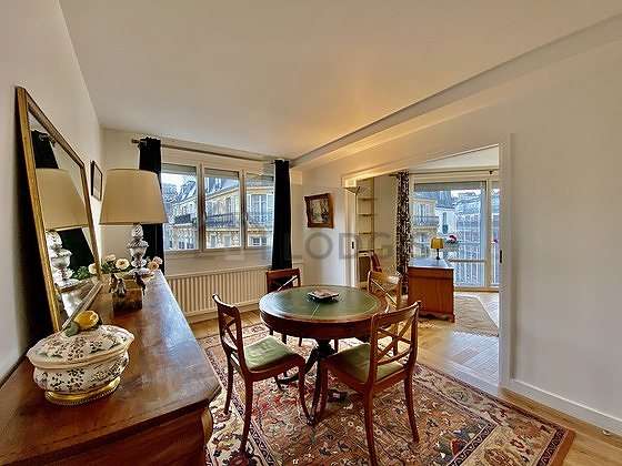 In order to share your meals in a convivial atmosphere during your stay parisian, this apartment offers a great dining room thanks to its dining table, sideboard, crockery, 1 chair(s), painting, set of tables, carpet, vase.