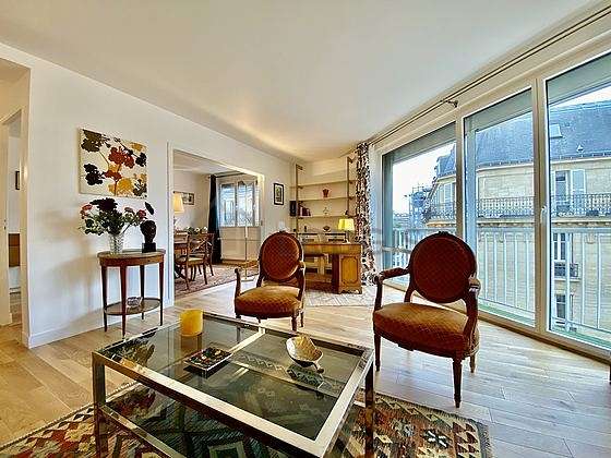 Living roomThis apartment consists of a beautiful living room with wooden floor and its double-glazed windows. This very quiet living room is furnished and equipped for a comfortable stay: tv, linen, sofa, 1 armchair(s), desk, shelves, storage space, sideboard, 1 chair(s), entry way table, airer, floor lamp, bin, painting, carpet, vase1 sofabed(s) of 140cm.