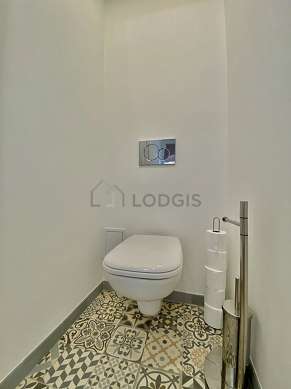 This apartment is equipped with a great bathroom and very bright. This bathroom is furnished with all the equipment you need for a comfortable stay: bath towels, cupboard, bath tub, stool, hair-dryer, mirror, bin, towel drying radiator. The toilets are separated from the bathroom and located in an independant room.