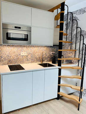 This duplex consists of great kitchen with wooden floor and all the essential equipment for your daily life: hob, refrigerator, combined microwave oven, kettle, coffee-maker, crockery.