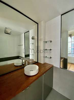 This apartment is equipped with a great bathroom and very bright. This bathroom is furnished with all the equipment you need for a comfortable stay: shelves, closet, bath tub, sink, towel drying radiator. The toilets are separated from the bathroom and located in an independant room.