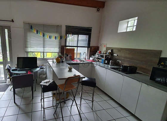 This house consists of kitchen close to the living room and all the essential equipment for your daily life: hob, refrigerator, freezer, oven, microwave oven, extractor hood, stool, bar.