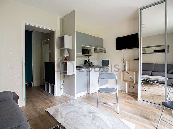 Living roomThis apartment consists of a beautiful living room with wooden floor and its windows with balcony and view on courtyard. This very quiet living room is furnished and equipped for a comfortable stay: tv, dining table, coffee table, wardrobe, shelves, cupboard, 2 chair(s), mirror, painting.