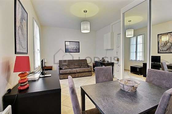 Living roomThis apartment consists of a beautiful living room with tile floor and its windows. This very quiet living room is furnished and equipped for a comfortable stay: tv, linen, quilt, dining table, shelves, cupboard, 1 chair(s)1 sofabed(s) of 140cm.
