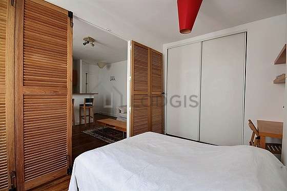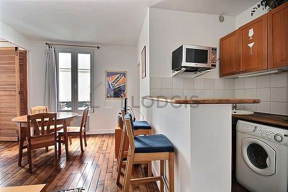 Living roomThis apartment consists of a wonderful living room with wooden floor and its double-glazed windows. This very quiet living room is furnished and equipped for a comfortable stay: sofa, dining table, coffee table, 3 chair(s), bar, painting, carpet.