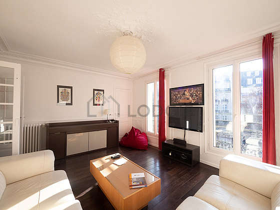 Living roomThis apartment consists of a living room its double-glazed windows. This living room is furnished and equipped for a comfortable stay: tv, sofa, dining table, coffee table, bookcase, shelves, sideboard, 1 chair(s), tv stand.