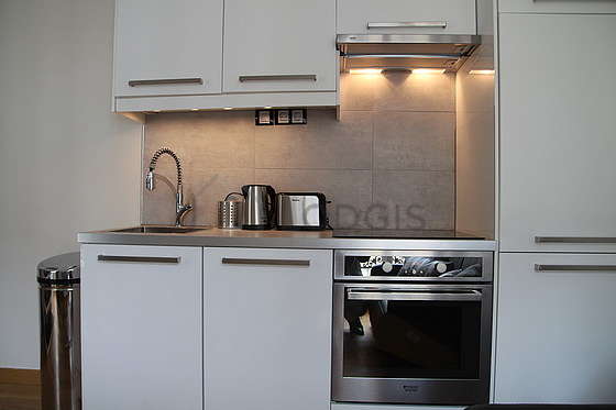 This apartment consists of great kitchen with wooden floor and all the essential equipment for your daily life: hob, refrigerator, freezer, combined microwave oven, extractor hood, toaster, kettle, cupboard, crockery.