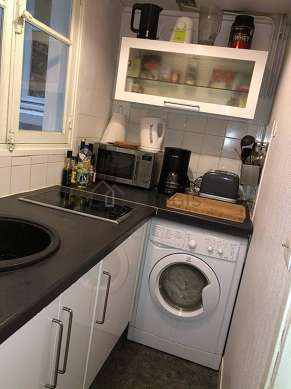 Living roomThis apartment consists of a charming living room with tile floor view on courtyard. This very quiet living room is furnished and equipped for a comfortable stay: tv, linen, quilt, sofa, dining table, shelves, cupboard, 1 chair(s).
