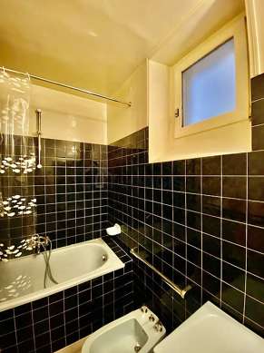 This apartment is equipped with a great bathroom and very bright. This bathroom is furnished with all the equipment you need for a comfortable stay: bath towels, shelves, storage space, bath tub, airer, sink, mirror, bin, carpet. The toilets are separated from the bathroom and located in an independant room.