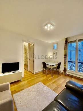 Living roomThis apartment consists of a beautiful living room with wooden floor and its double-glazed windows. This very quiet living room is furnished and equipped for a comfortable stay: tv, sofa, 1 armchair(s), dining table, bookcase, 1 chair(s), bedside table, painting, carpet.
