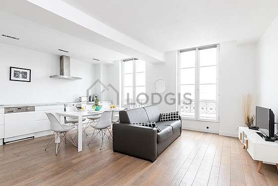 Living roomThis apartment consists of a fabulous living room with wooden floor view on road. This quiet living room is furnished and equipped for a comfortable stay: tv, refrigerator, sofa, dining table, wardrobe, bookcase, shelves, closet, cupboard, crockery, 1 chair(s), bedside table, airer, mirror, bin, painting, vase.