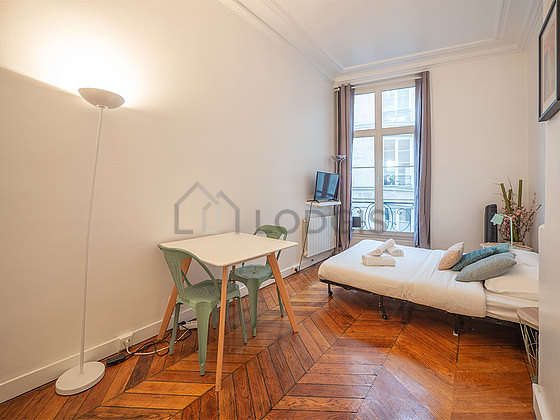 Living roomThis apartment consists of a pleasant living room with wooden floor view on road. This quiet living room is furnished and equipped for a comfortable stay: tv, linen, quilt, dining table, closet, cupboard, 1 chair(s), bedside table1 sofabed(s) of 140cm.