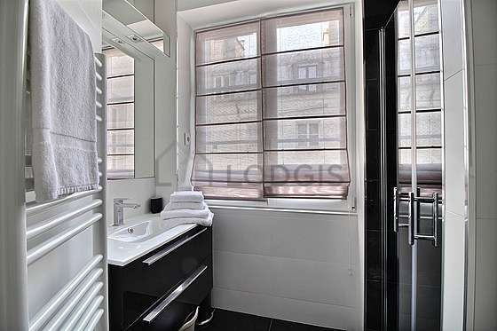 Living roomThis apartment consists of a fabulous living room with wooden floor and its windows. This very quiet living room is furnished and equipped for a comfortable stay: tv, quilt, sofa, coffee table, shelves, 1 chair(s), floor lamp, mirror, carpet.