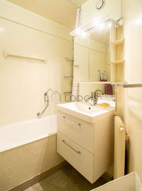 This apartment is equipped with a pleasant bathroom. This bathroom is furnished with all the equipment you need for a comfortable stay: bath towels, shelves, cupboard, bath tub, airer, sink, towel rack. The toilets are separated from the bathroom and located in an independant room.