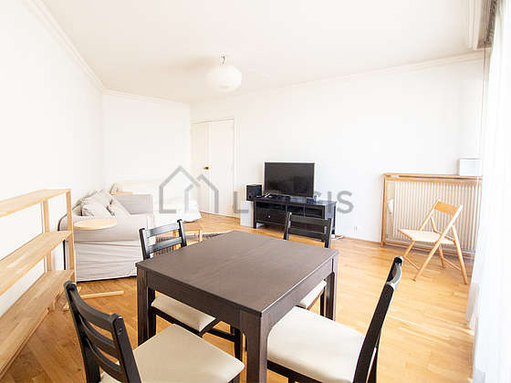Living roomThis apartment consists of a attractive living room with wooden floor and its windows with balcony. This very quiet living room is furnished and equipped for a comfortable stay: tv, sofa, dining table, coffee table, shelves, cupboard, 5 chair(s), bedside table, tv stand, carpet.