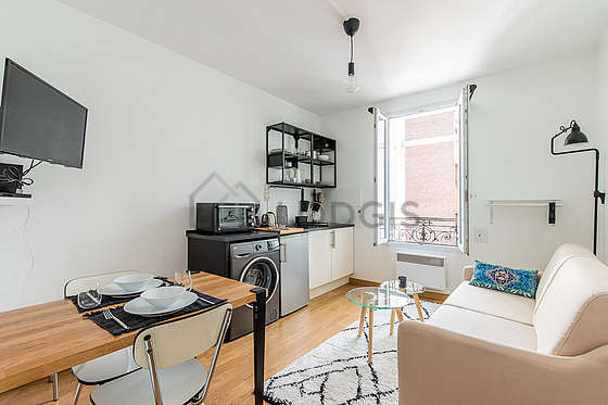 Living roomThis apartment consists of a fabulous living room with wooden floor and its double-glazed windows. This very quiet living room is furnished and equipped for a comfortable stay: tv, quilt, refrigerator, sofa, dining table, desk, wardrobe, shelves, closet, cupboard, crockery, 1 chair(s), stool, bin, painting, set of tables, carpet1 sofabed(s) of 140cm.