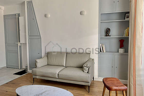 Living roomThis apartment consists of a beautiful living room with wooden floor and its windows. This very quiet living room is furnished and equipped for a comfortable stay: tv, linen, quilt, sofa, 1 armchair(s), coffee table, desk, wardrobe, shelves, closet, cupboard.