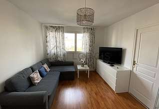Living roomThis apartment consists of a beautiful living room with wooden floor and its windows. This very quiet living room is furnished and equipped for a comfortable stay: tv, sofa, dining table, storage space.