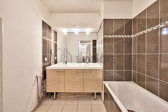 This apartment is equipped with a great bathroom and very bright. This bathroom is furnished with all the equipment you need for a comfortable stay: bath towels, bath tub, sink, towel rack, towel drying radiator, carpet. The toilets are separated from the bathroom and located in an independant room.