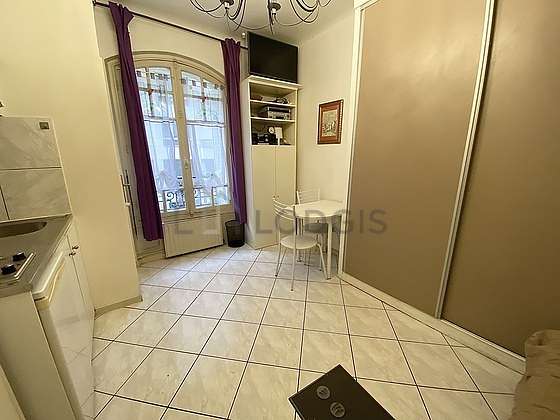 This apartment consists of a beautiful living room with tile floor and its windows and view on road. This living room is furnished and equipped for a comfortable stay: tv, linen, quilt, dining table, wardrobe, shelves, cupboard, 3 chair(s)1 sofabed(s) of 140cm.