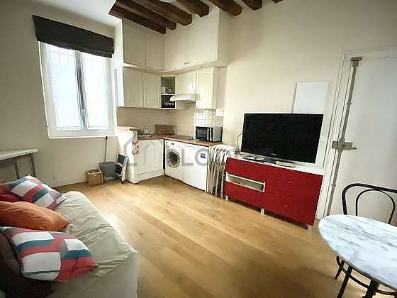 This apartment consists of a wonderful living room with wooden floor and its double-glazed windows with balcony and view on courtyard. This quiet living room is furnished and equipped for a comfortable stay: tv, dining table, coffee table, cupboard, 1 chair(s), stool, floor lamp, tv stand, bin1 sofabed(s) of 120cm.