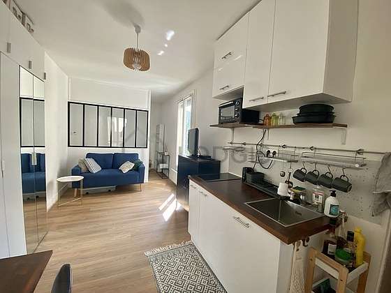Living roomThis apartment consists of a beautiful living room with wooden floor and its windows. This very quiet living room is furnished and equipped for a comfortable stay: tv, coffee table, wardrobe, shelves, storage space, cupboard, stool.