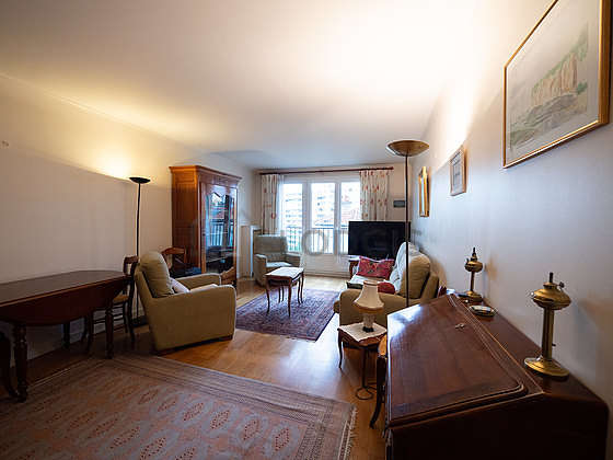 Living roomThis apartment consists of a fabulous living room with wooden floor view on road. This very quiet living room is furnished and equipped for a comfortable stay: tv, sofa, 1 armchair(s), dining table, storage space, 4 chair(s), blinds1 sofabed(s) of 140cm.