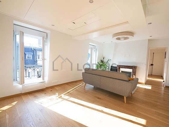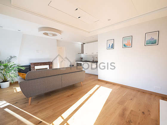 Living roomThis apartment consists of a beautiful living room with wooden floor and its double-glazed windows. This very quiet living room is furnished and equipped for a comfortable stay: tv, sofa, dining table, crockery, fireplace, 1 chair(s), floor lamp, painting, carpet1 bed(s) of 180cm.