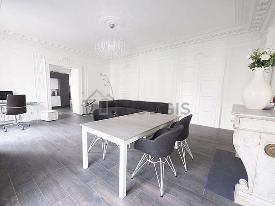 Living roomThis apartment consists of a beautiful living room with wooden floor and its windows. This very quiet living room is furnished and equipped for a comfortable stay: tv, sofa, dining table, 1 chair(s).