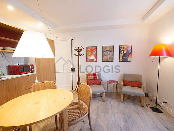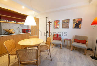 Living roomThis apartment consists of a living room with wooden floor and its windows. This living room is furnished and equipped for a comfortable stay: tv, 1 armchair(s), dining table, 1 chair(s).