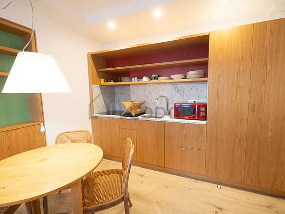 This apartment consists of great kitchen with wooden floor and all the necessary equipment for your daily life: hob, refrigerator, microwave oven, dining table, cupboard, crockery, 1 chair(s).