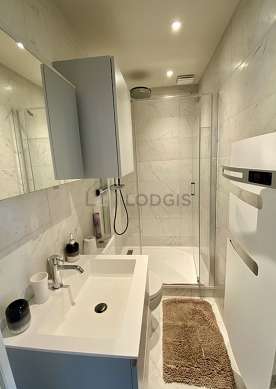 This apartment is equipped with a great bathroom and very bright. This bathroom is furnished with all the equipment you need for a comfortable stay: cupboard, separate shower, sink, mirror, towel drying radiator, ceiling light, carpet, ventilator. The toilets are located in the bathroom.