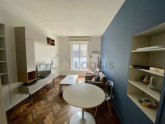 Living roomThis apartment consists of a wonderful living room with wooden floor. This very quiet living room is furnished and equipped for a comfortable stay: sofa, 2 armchair(s), dining table, coffee table, shelves, cupboard, 3 chair(s), floor lamp, tv stand, blinds.