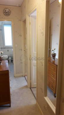 This apartment also has a entrance equipped with closet, storage space, mirror, coat stand, painting.