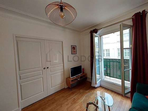 This apartment consists of a fabulous living room with wooden floor and its double-glazed windows. This very quiet living room is furnished and equipped for a comfortable stay: tv, sofa, 1 armchair(s), dining table, shelves, 1 chair(s), floor lamp, tv stand.