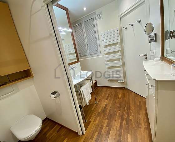 This apartment is equipped with a bathroom. This bathroom is furnished with all the equipment you need for a comfortable stay: cupboard, separate shower, hair-dryer, airer, sink, mirror, towel rack, towel drying radiator, ceiling light. The toilets are located in the bathroom.