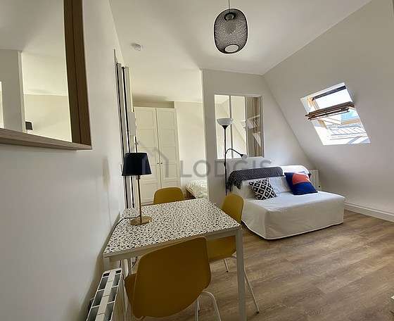 Living roomThis apartment consists of a beautiful living room with wooden floor. This very quiet living room is furnished and equipped for a comfortable stay: quilt, sofa, dining table, closet, 3 chair(s), bedside table, floor lamp, lamp, mirror, bin, painting1 bed(s) of 140cm.