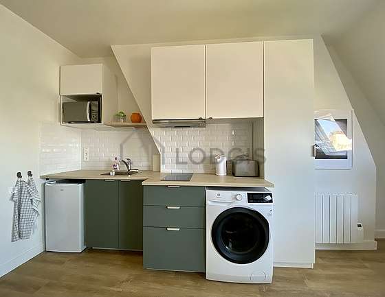 This apartment consists of great kitchen with wooden floor and all the essential equipment for your daily life: hob, refrigerator, freezer, microwave oven, extractor hood, toaster, kettle, cupboard, crockery, painting.