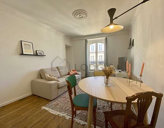 Living roomThis apartment consists of a wonderful living room with wooden floor and its double-glazed windows. This very quiet living room is furnished and equipped for a comfortable stay: tv, sofa, dining table, 3 chair(s), tv stand, curtains, painting, carpet.