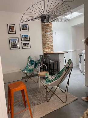 Living roomThis apartment consists of a wonderful living room with tile floor and its double-glazed windows and view on courtyard. This very quiet living room is furnished and equipped for a comfortable stay: tv, quilt, sofa, coffee table, bookcase, cupboard, 1 chair(s), stool, lamp1 murphy bed(s) of 140cm.