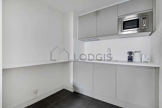 This apartment consists of great kitchen close to the living room with tile floor and all the essential equipment for your daily life: hob, refrigerator, freezer, microwave oven, toaster, kettle, coffee-maker, cupboard.