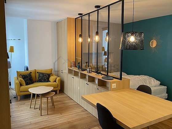 Living roomThis apartment consists of a wonderful living room with wooden floor and its double-glazed windows. This very quiet living room is furnished and equipped for a comfortable stay: linen, quilt, sofa, dining table, coffee table, wardrobe, shelves, closet, cupboard, crockery, 2 chair(s), floor lamp, lamp, mirror, coat stand, painting, set of tables, vase1 bed(s) of 140cm.