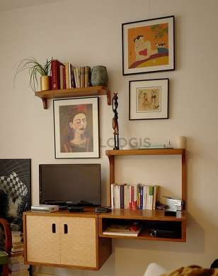 Living roomThis apartment consists of a living room its windows. This living room is furnished and equipped for a comfortable stay: tv, coffee table, bookcase, closet.