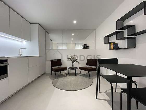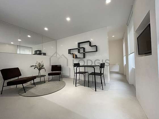 Living roomThis apartment consists of a beautiful living room with tile floor and its double-glazed windows. This very quiet living room is furnished and equipped for a comfortable stay: tv, dining table, coffee table, shelves, 4 chair(s), ceiling light, carpet.