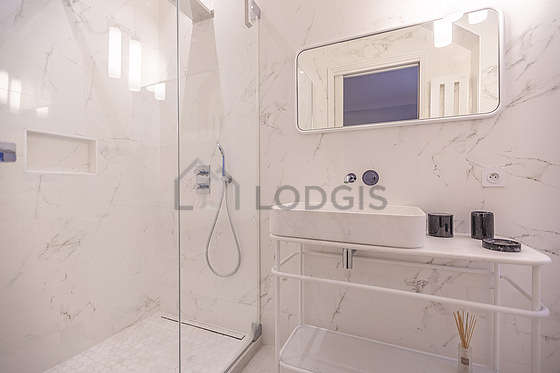 This apartment is equipped with a bathroom. This bathroom is furnished with all the equipment you need for a comfortable stay: bath towels, shelves, separate shower, sink, sink, towel drying radiator. The toilets are separated from the bathroom and located in an independant room.